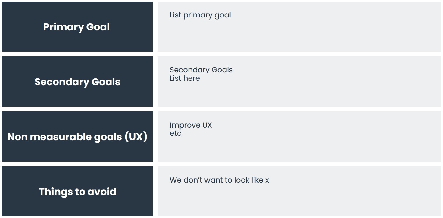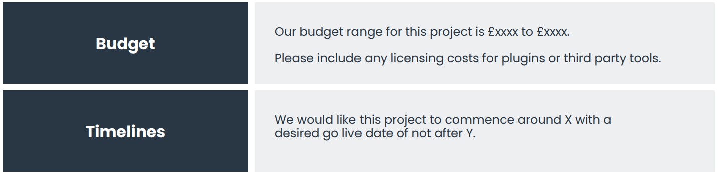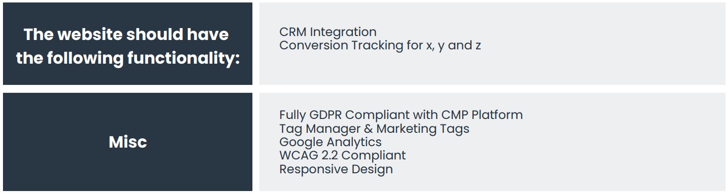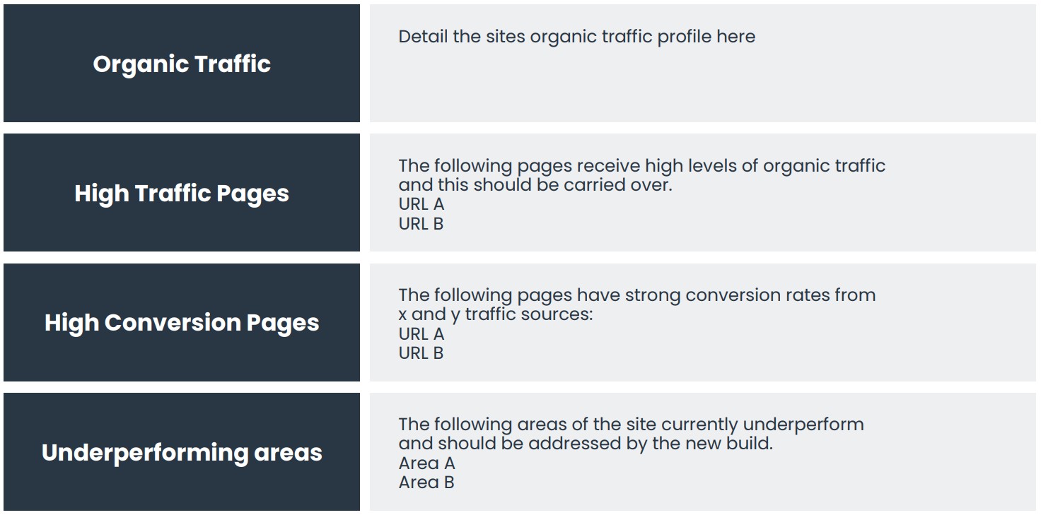 Note this is not in exactly the same order as we unearth the information as whilst that is the best approach for the research, the structure here makes the most sense to structure the information for your dream website developer.